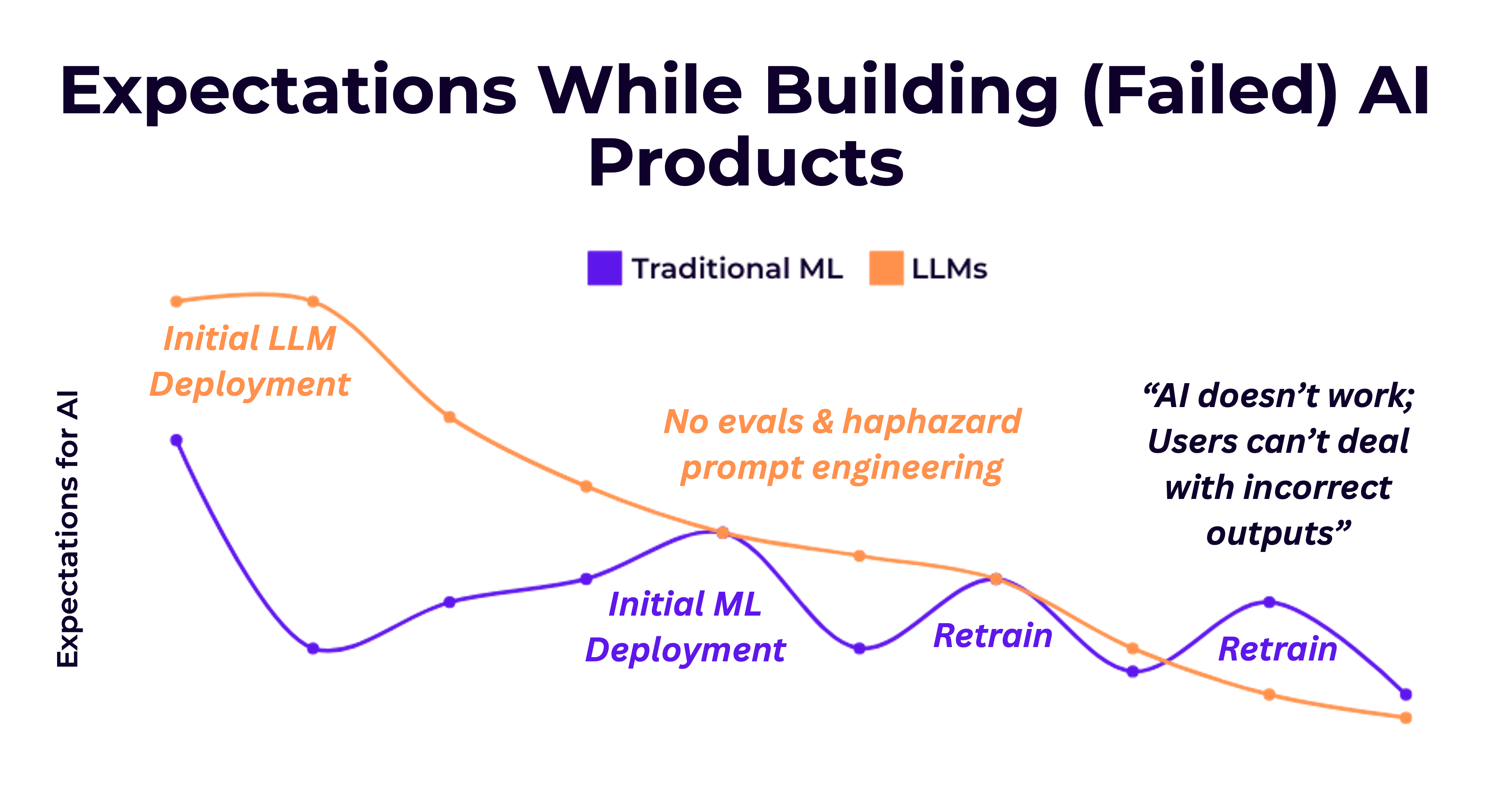 Consider one reason for why data preparation for traditional ML was so challenging from an HCI or UX lens: people would need to put in so much effort to get even some shitty accuracy metric, and there were no good “progress” indicators throughout the entire workflow until some trained model emerged with better-than-average accuracy. Such effort correlates with sunk cost fallacy, particularly in organizations where leadership does not understand the finnicky nature of ML. (Not to mention how every university or AI course sells its potential like snake oil—making it feel all-the-more important to get some model deployed.) Upon deployment, people generally have such high hopes for ML, and these hopes are only deflated with time.